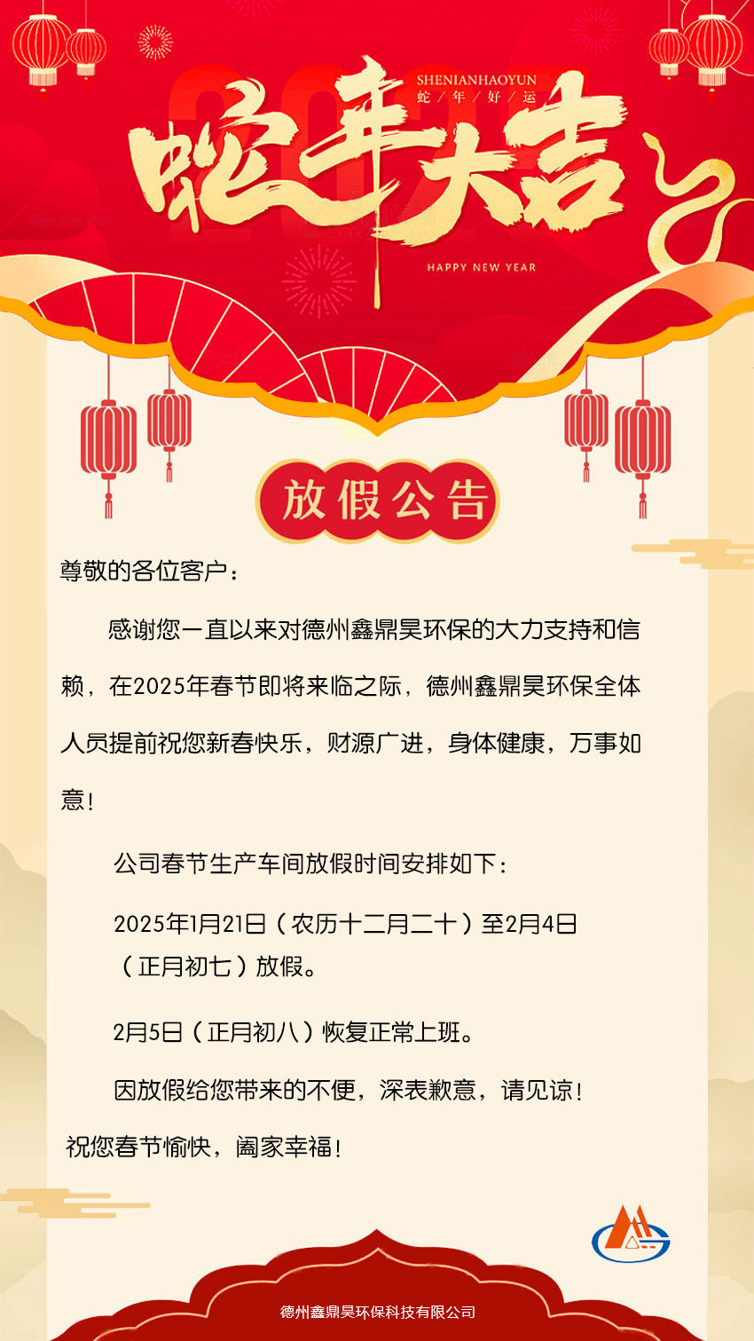 德州鑫鼎昊環(huán)保2025年春節(jié)放假通知