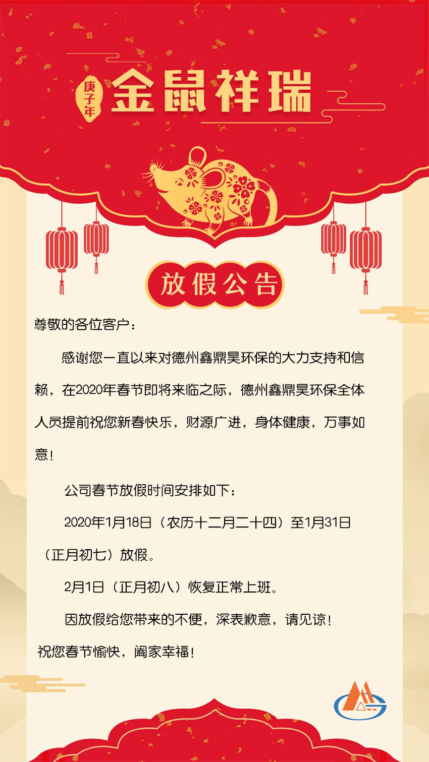 德州鑫鼎昊環(huán)保2020年春節(jié)放假通知